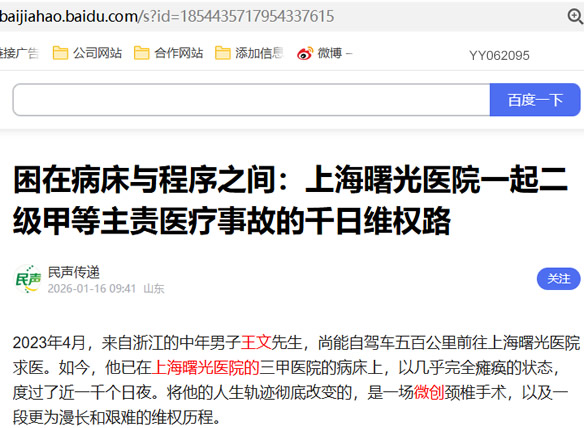 2023年4月,来自浙江的中年男子王文先生,尚能自驾车五百公里前往上海曙光医院求医。如今,他已在上海曙光医院的三甲医院的病床上,以几乎完全瘫痪的状态,度过了近一千个日夜。将他的人生轨迹彻底改变的,是一场微创颈椎手术,以及一段更为漫长和艰难的维权历程。